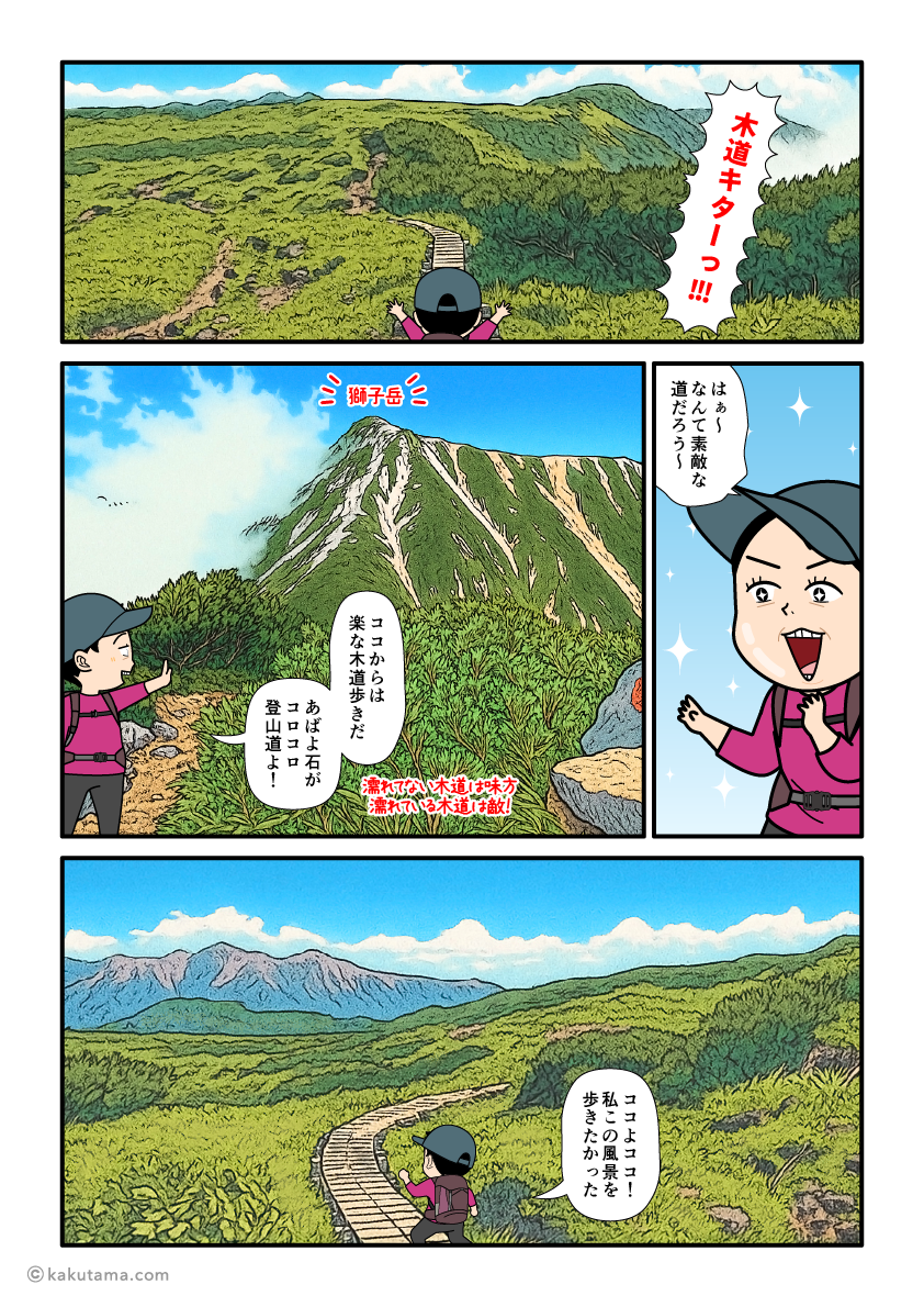 北アルプス、五色ヶ原山荘に到着した登山者の漫画とイラスト