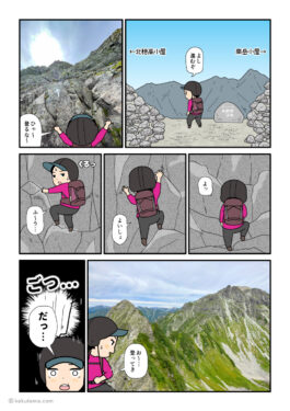涸沢ヒュッテの前を素通りして、石の階段を登っていく。